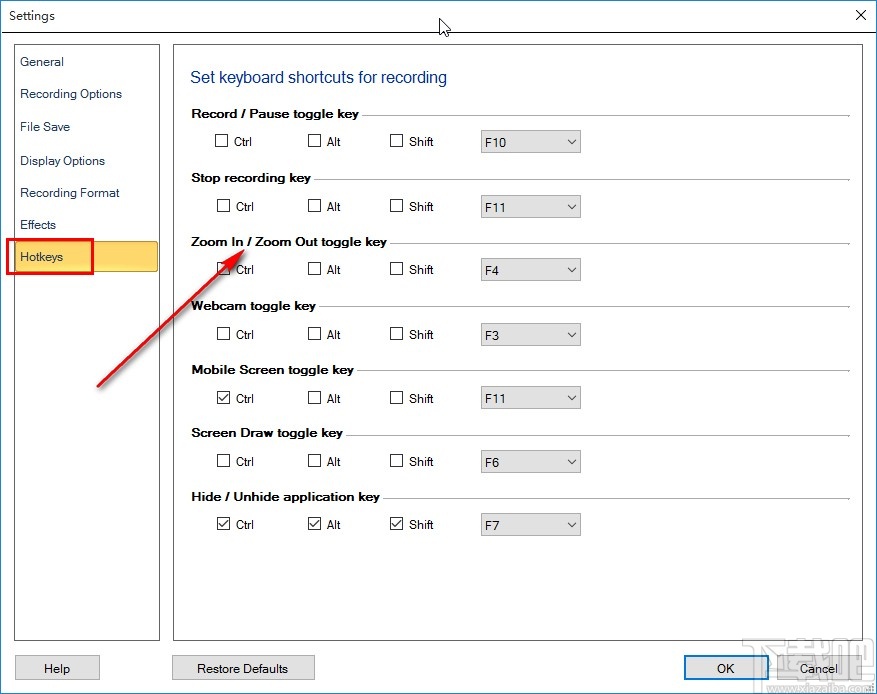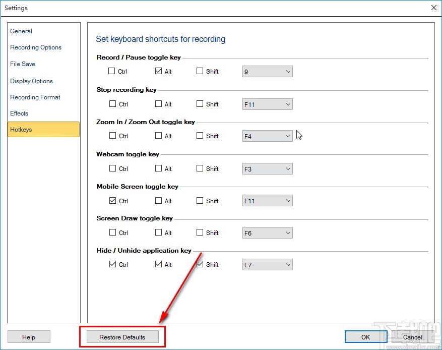 6.如果用户将快捷键设置得太乱的话,会出现一些热键占用的情况,这样我们点击下方的Restore Defaults这个按钮就可以将快捷键恢复为软件默认的快捷键了。