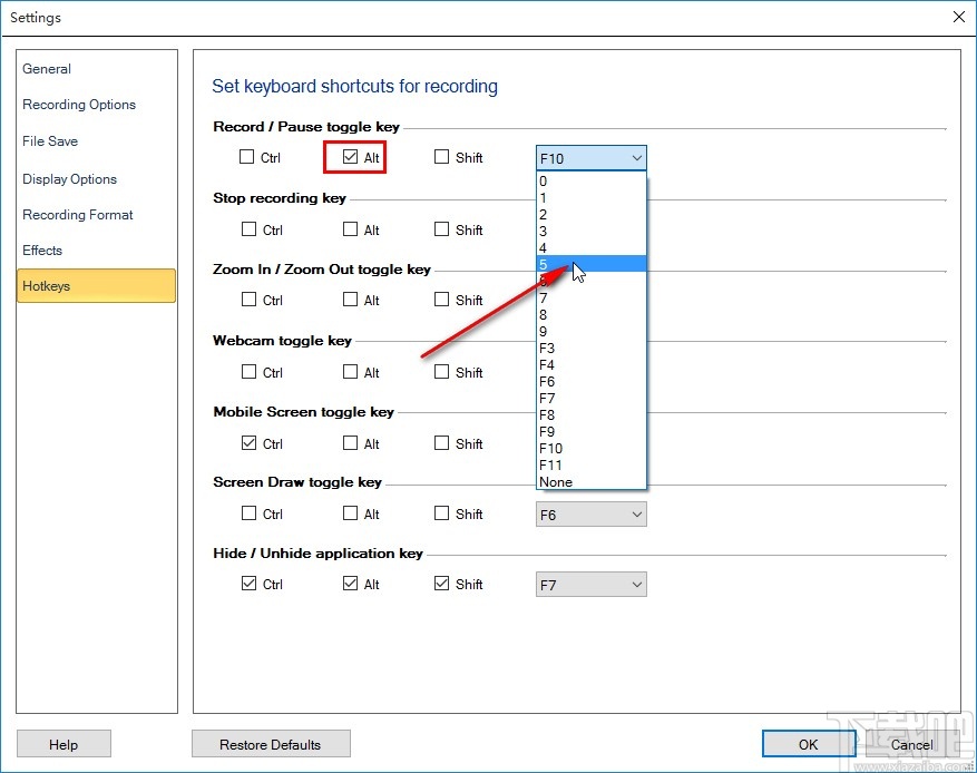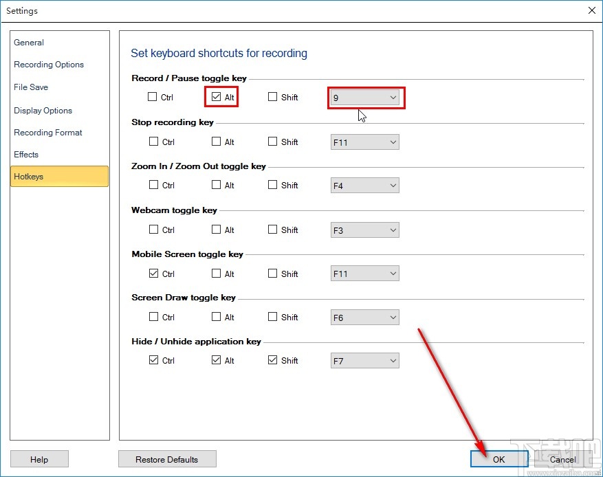 5.根据自己的需求设置好快捷键之后点击下方的OK按钮,比如下图中小编设置了第一个操作进行暂停录制的快捷键,选择为Alt+9,这样按下Alt+9快捷键就可以暂停录制了。