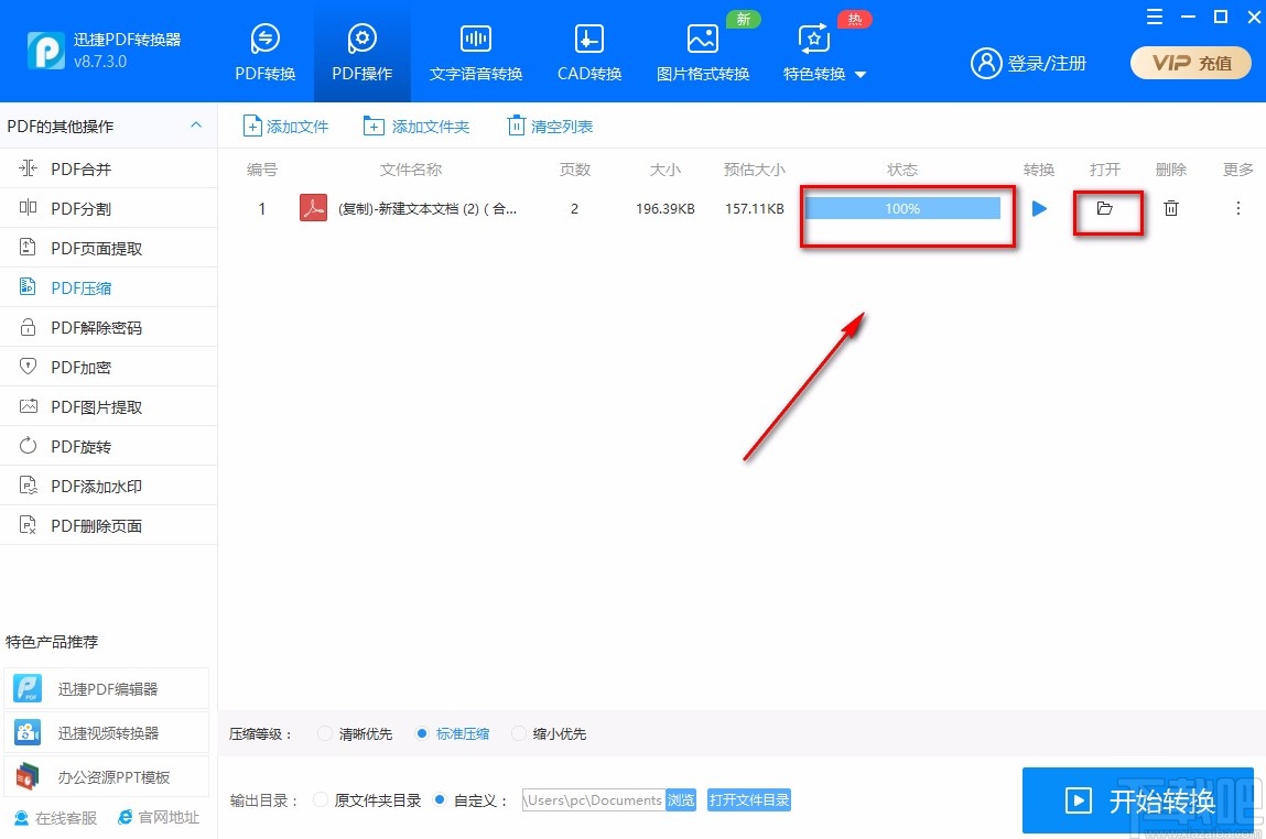 7.文件压缩完毕后,我们在界面上方就可以看到状态栏下方显示的是100%;这时候点击打开栏下方的文件打开按钮,就可以查看压缩后的文档。