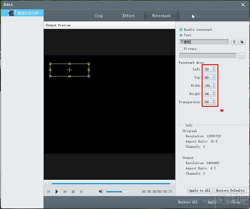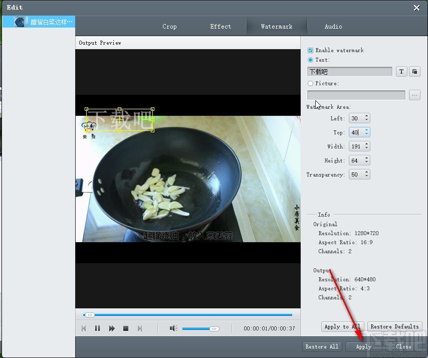 8.直接输入数值参数调整好水印的位置之后,预览效果满意的话就点击右下角的Apply这个应用按钮应用修改了。