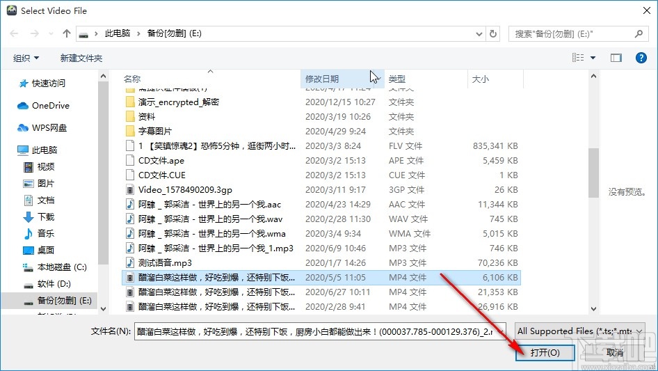 2.点击这个添加按钮之后,在出现的界面中,我们找到目标视频文件选中之后,在界面的右下角点击打开按钮,准备打开想要选择的这个视频。