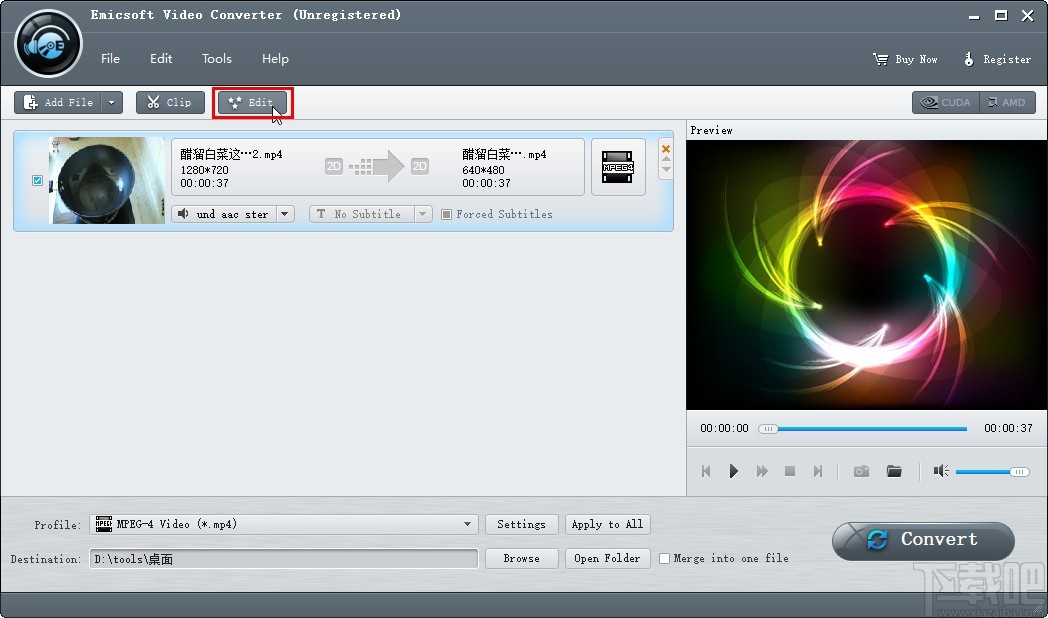 3.点击选择这个视频之后,我们在软件界面上方找到Edit这个编辑按钮,点击这个编辑按钮之后,我们可以打开编辑视频的功能选择界面。
