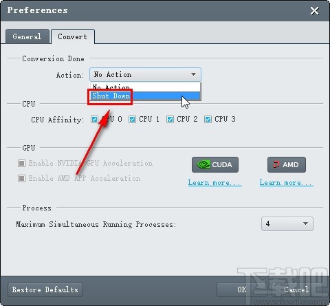5.切换到转换设置界面之后,在这个设置界面中我们找到Conversion Done这个模块,将Action这个动作选项选择为Shut Down这个选项,表示关闭软件。