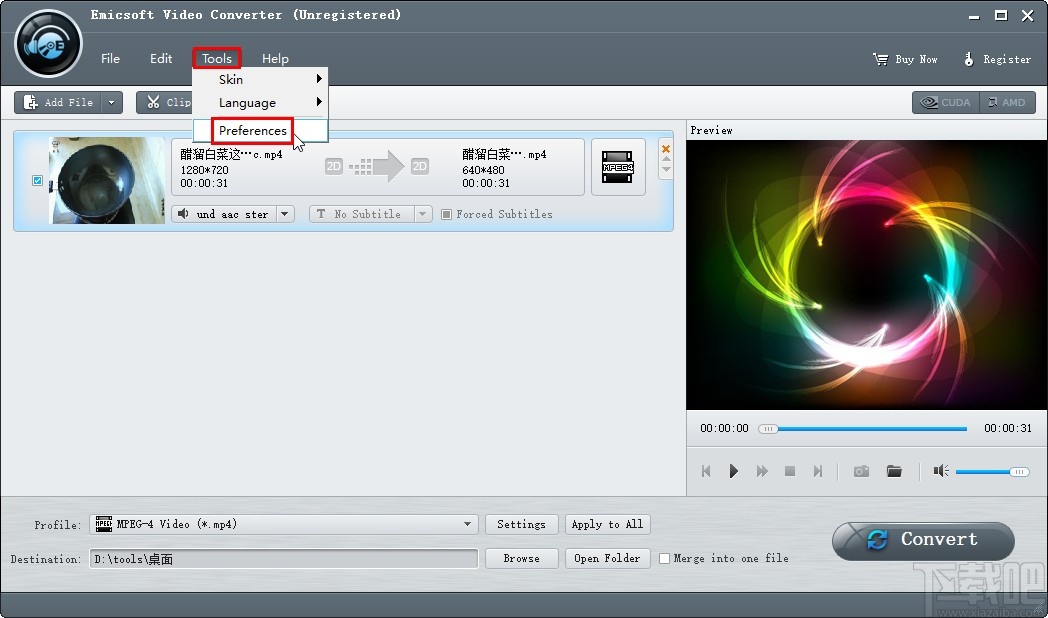 3.成功添加文件之后,我们根据自己的需求对转换参数进行设置,设置之后点击上方的Tools这个工具选项,在打开的界面中选择Preferences这个选项界面。