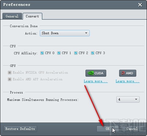 6.最后设置好转换完成关闭软件这个功能之后,我们点击右下角的这个OK按钮保存设置,保存之后就完成所有的设置了。