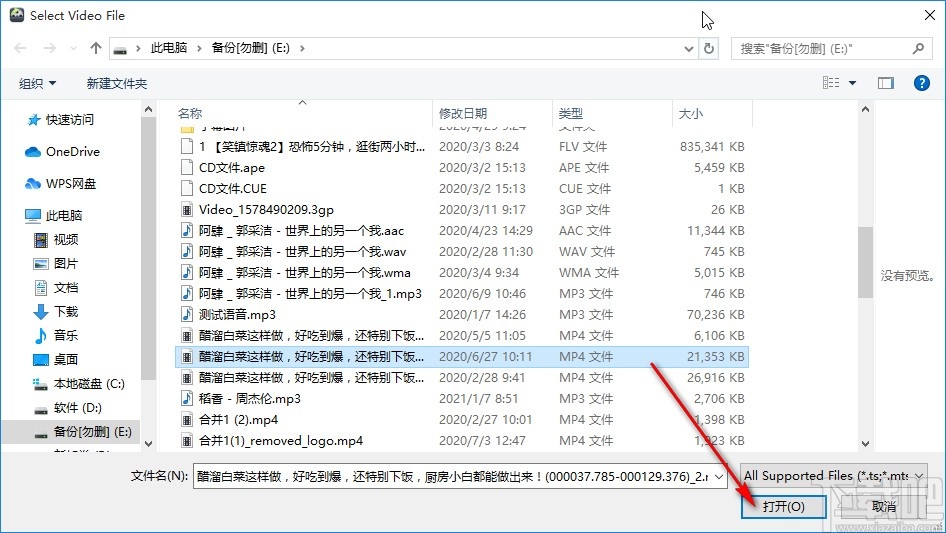 2.点击添加文件按钮之后,打开一个选择文件的界面,我们在其中选中想要处理的视频文件之后,点击右下角的打开按钮。