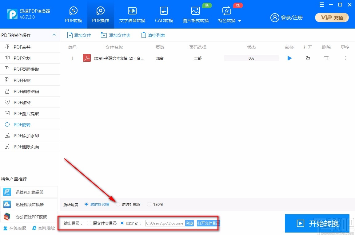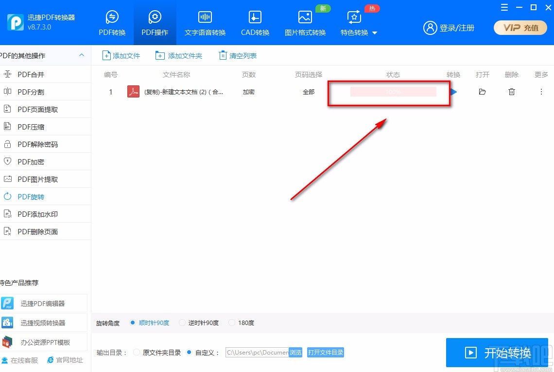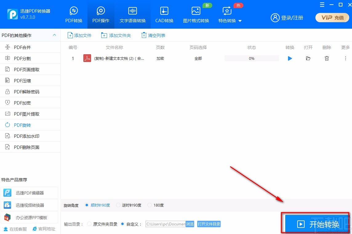 6.完成以上所有步骤后,我们在界面右下角找到“开始转换”按钮,点击该按钮就可以开始旋转PDF文件了。