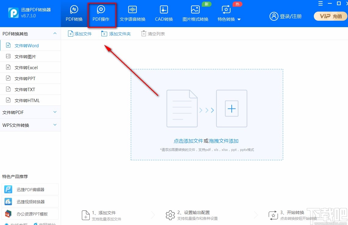 1.首先打开软件,我们在界面上方找到“PDF操作”选项,点击该选项就可以进入到PDF操作页面。