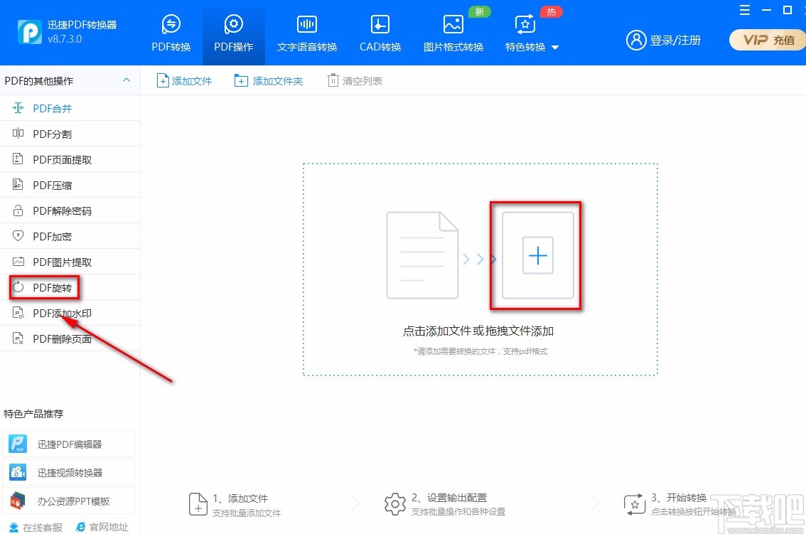 2.接着在界面左侧找到“PDF旋转”选项,我们点击该选项后,再点击界面上的加号图标按钮即可进入到文件添加页面。