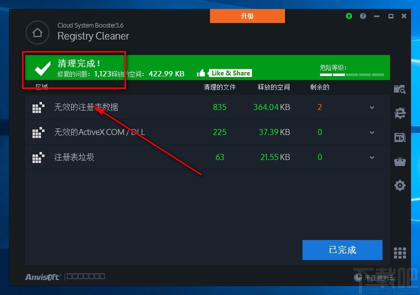 6.清理注册表的速度非常快,清理完毕后,我们在界面左上方会看到“清理完成”的提示字样,如下图所示,大家可以作为参考。