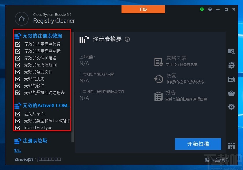 3.勾选好需要清理的注册表类型后,我们在界面右下角找到蓝色的“开始扫描”按钮,点击该按钮就可以开始扫描电脑中无用的注册表。