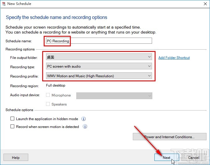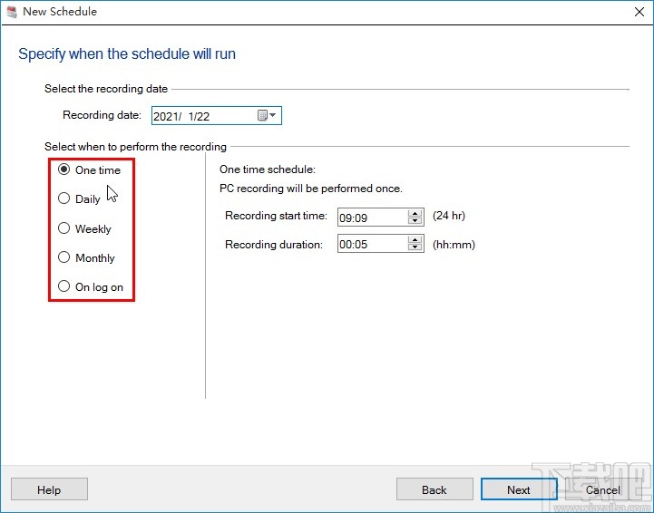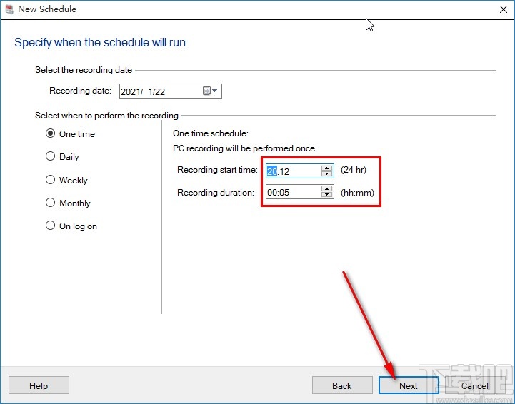 5.下一步根据自己的需求设置好录制类型之后,在界面右边就可以找到录制开始时间和录制持续时间的选项了,根据自己的需求设置之后点击Next下一步按钮。