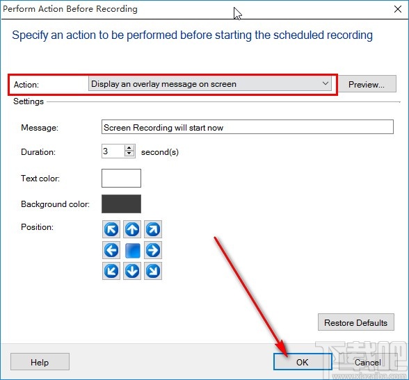 7.点击New按钮添加操作之后会出现下图所示的界面,我们根据自己的需求点击Action选项的下拉列表,选择想要执行的操作,然后点击下方的OK按钮。