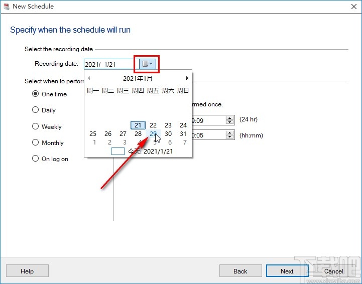3.填写好信息数据之后点击下一步按钮可以来到下图所示的界面,其中可以根据自己的需求来设置定时录制的时间,点击日历图标打开日历界面,选择定时录制的日期。