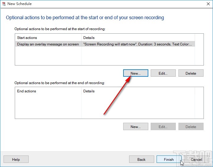 6.点击这个下一步按钮之后会出现下图所示的界面,在这个界面中第一个模块是设置开始录制时执行的操作,点击New按钮即可添加执行的操作,下方的模块表示结束录制时要执行的操作,也是一样的点击New按钮准备添加操作。