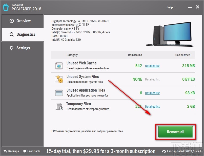 4.接下来在界面右下角找到绿色的“Remove all”按钮,它表示移除所有的意思,我们点击该按钮就可以开始清理垃圾文件。