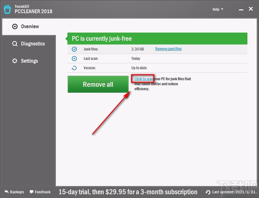1.首先打开软件,打开软件后,软件就会自动扫描电脑系统中的垃圾文件;如果我们想要再次扫描电脑系统,就可以点击界面上的“Click to scan”按钮扫描系统。