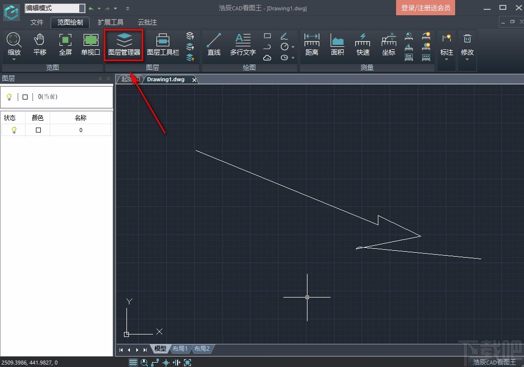 2.接着我们在界面左上方找到“图层管理器”选项卡,点击该选项卡,界面上就会出现一个图层特性管理器对话框。