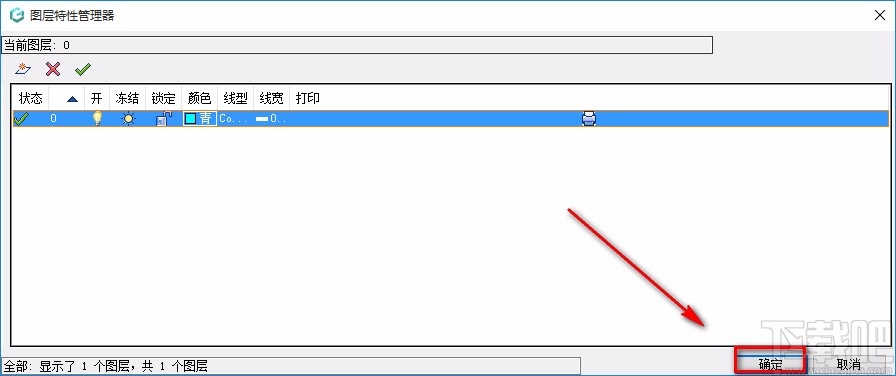 5.随后就可以返回到图层特性管理器对话框,我们在对话框的右下角找到“确定”按钮,点击该按钮就成功设置好图层颜色了。
