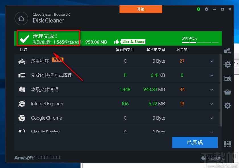 5.清理磁盘的速度非常快,清理结束后,我们在界面左上方会看到“清理完成”的提示字样,如下图所示,大家可以作为参考。