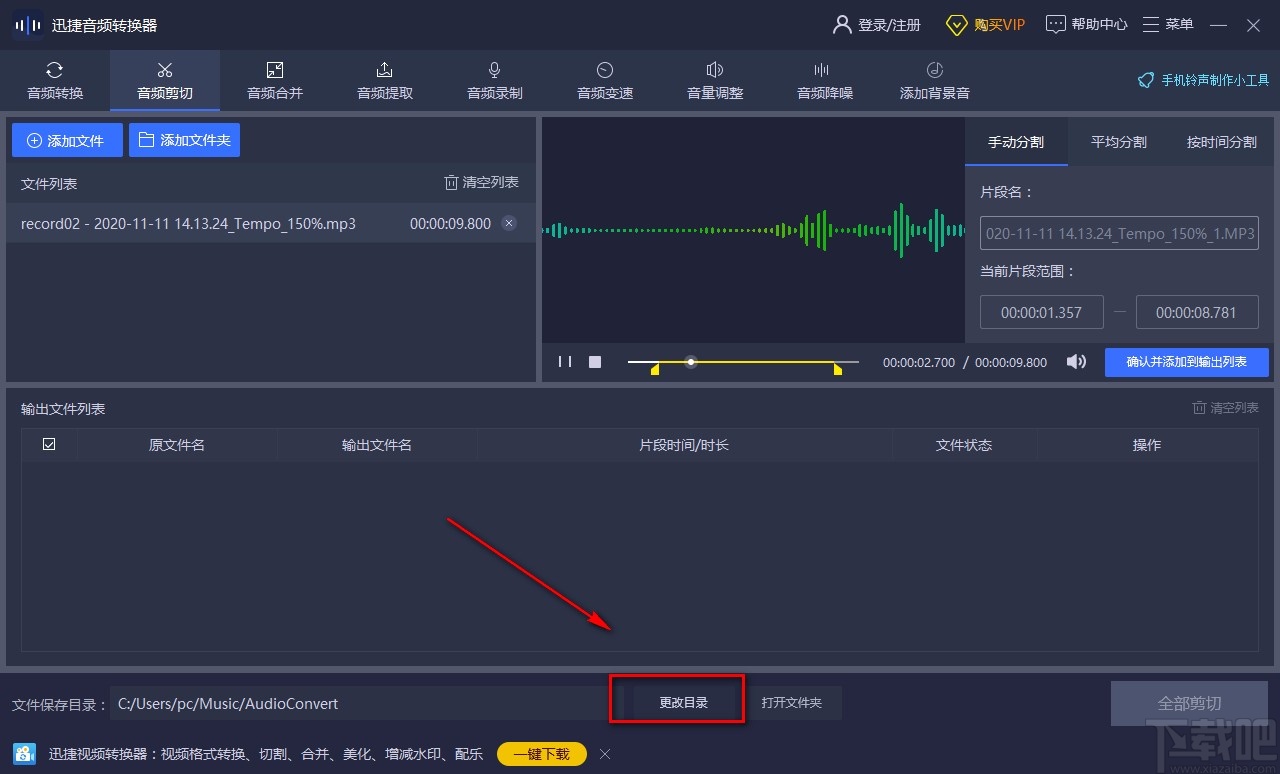 8.然后在界面下方找到“更改目录”按钮,我们点击该按钮就可以设置文件的输出文件夹,如下图所示。
