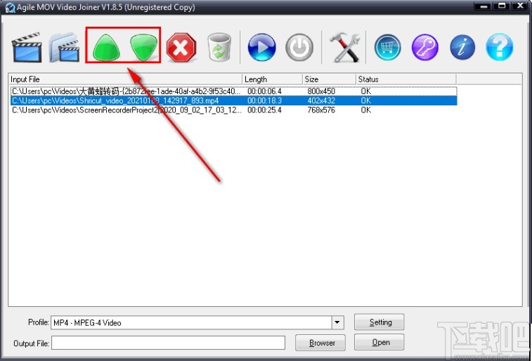 3.将想要合并的视频添加到软件界面之后,我们点击选中其中一个视频,可以点击上方的上移、下移按钮来调整它们之间的合并顺序。
