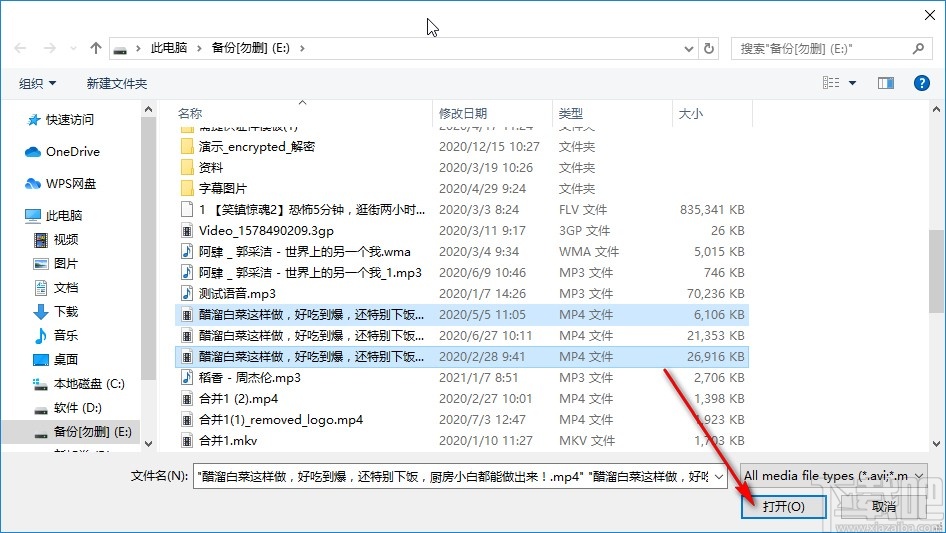 2.点击添加文件按钮之后打开一个选择文件的界面,我们根据自己的需求选中目标视频文件之后,点击右下角的打开按钮。
