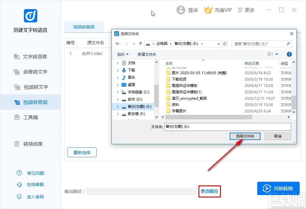 5.选择好这个输出保存路径之后,在界面的右下角可以看到有一个开始转换按钮,点击这个开始转换按钮之后就可以开始转换操作了。