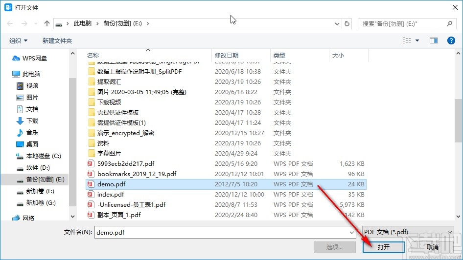 2.点击这个打开按钮之后,接下来在出现的选择文件界面中,我们选中目标PDF文件之后,点击右下角的这个打开按钮。