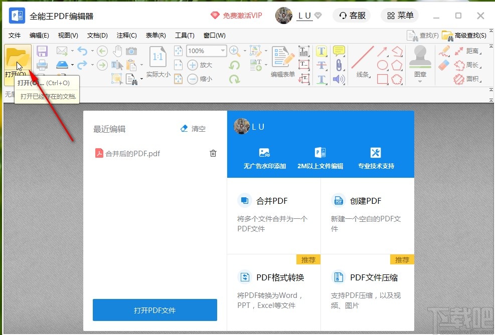 1.首先第一步我们打开软件之后,在软件界面的左上角找到打开这个功能图标,点击之后准备选择文件进行打开。