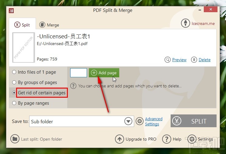 5.紧接着下一个分割方式是将某些页面删除掉,可以在输入框中直接输入想要删除页面的页码,或者点击Add page按钮进行添加。