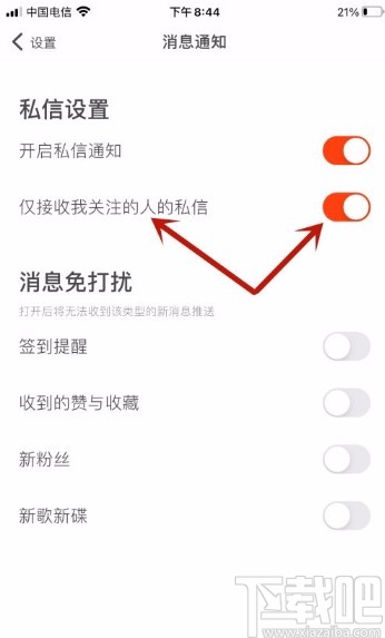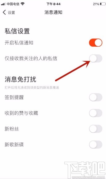5.最后点击“仅接收我关注的人的私信”选项后面的开关按钮,使其处于关闭状态,如下图所示,这就表示成功允许接收所有人的私信了。