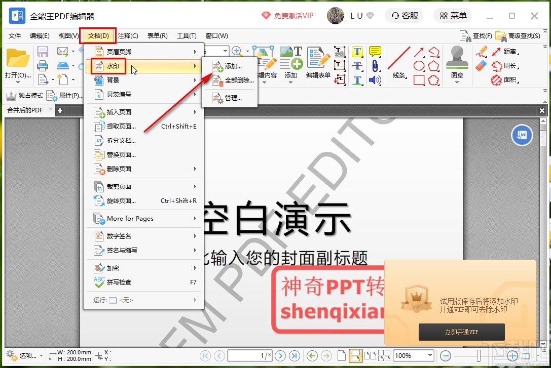 3.点击这个打开按钮将PDF文件成功添加到软件界面之后,在界面上方找到文档这个选项,然后在出现的菜单列表中找到水印这个选项并点击,点击之后选择子菜单中的添加。