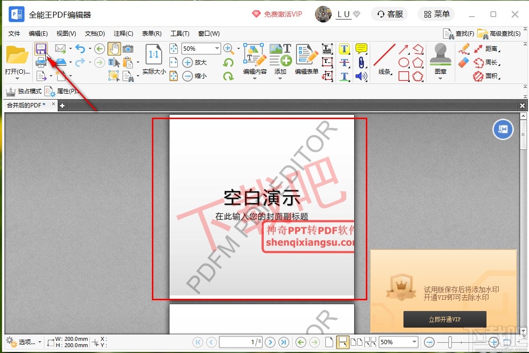 7.点击确定按钮确定好水印的添加效果之后,回到软件主界面,可以看到文件添加水印之后的效果,满意的话点击左上方的保存按钮保存PDF文件即可。