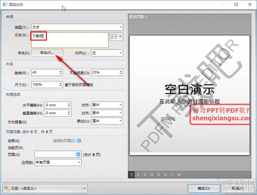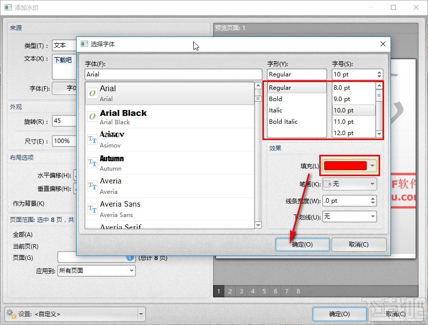 5.点击这个字体按钮之后就会打开设置水印字体的界面了,可以设置字体、字号、颜色等参数,设置完成之后点击确定按钮即可。