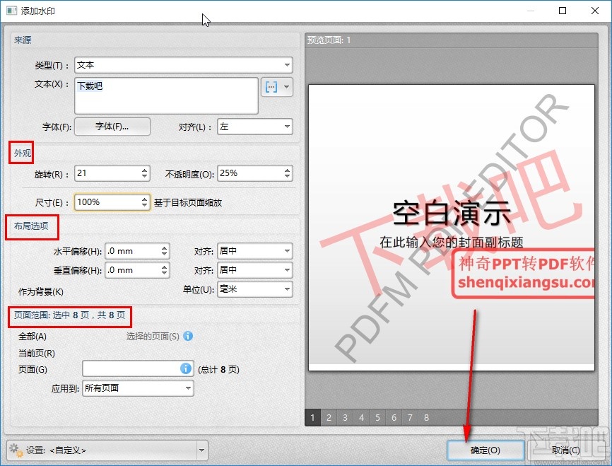 6.点击这个确定按钮保存文本的样式之后,可以根据自己的需求对外观、布局、页面范围进行设置,有需要的用户单独进行设置,没有需要的用户使用默认选项即可,然后点击右下角的确定按钮。