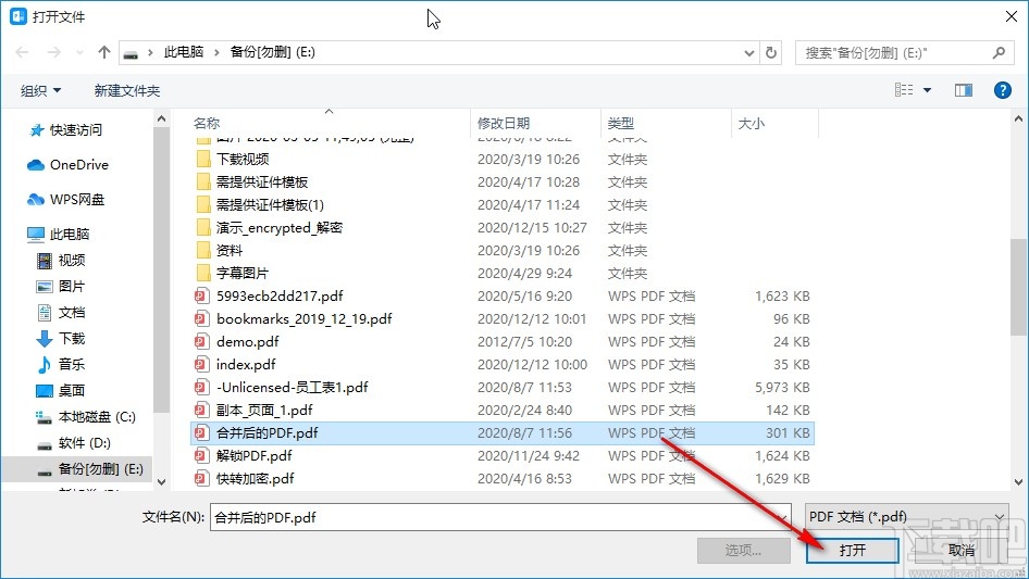 2.点击这个打开按钮之后,在出现的选择文件界面中,我们根据自己的需求来选择想要处理的PDF文件,选中之后点击打开按钮。