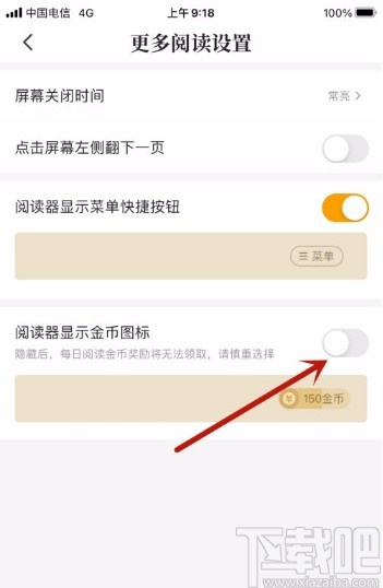 4.接下来就可以进入到“更多阅读设置”页面,我们在页面上找到“阅读器显示金币图标”选项,其后面有一个开关按钮。
