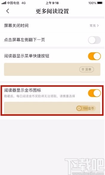 5.最后我们点击“阅读器显示金币图标”选项后面的开关按钮,使其处于打开状态,如下图所示,这就可以在阅读器中显示金币图标了。