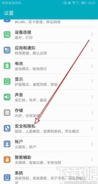 2.下一步进入到安全和隐私设置界面之后,在这个界面中我们找到指纹这个选项,然后点击进入到指纹相关的设置界面。