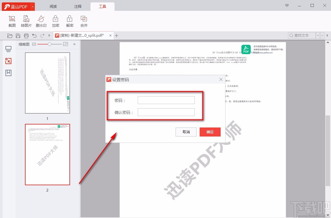 4.然后界面上就会出现一个“设置密码”窗口,我们在窗口中的“密码”和“确认密码”两个文本框中输入加密密码,再点击窗口右下角的“确定”按钮就可以了。