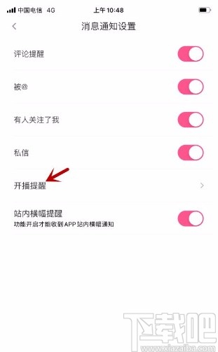 4.然后就会跳转到消息通知设置页面,我们在页面上找到“开播提醒”选项并点击进入即可。
