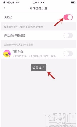 5.最后在页面上找到“免打扰”选项,点击该选项后面的开关按钮将其打开,界面上就会出现“设置成功”的提示字样,这就表示开启免打扰模式了。