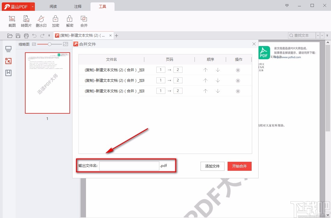 7.随后在窗口左下角找到“输出文件名”选项,其后面有一个文本框,我们在文本框中输入合并后的文件名称就可以了。