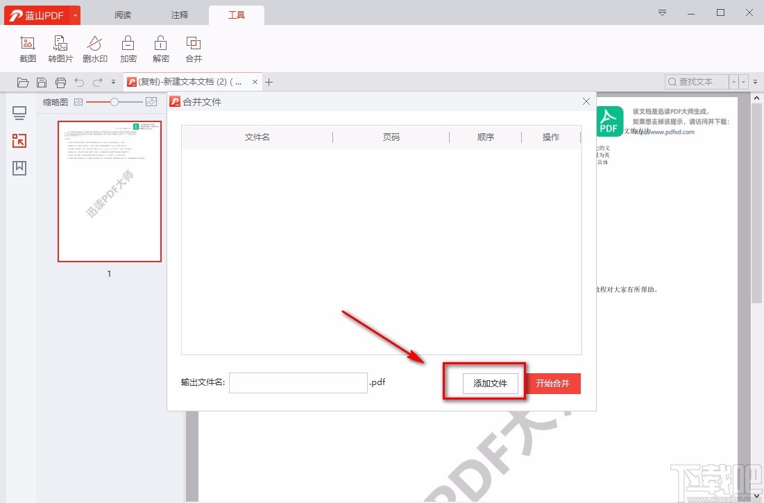 4.在合并文件窗口中,我们在窗口右下角找到“添加文件”按钮,点击该按钮就可以打开文件添加页面。