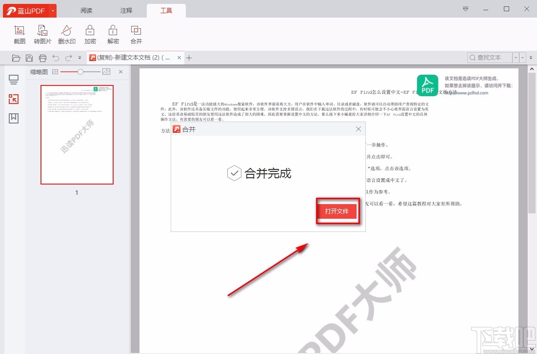 9.合并完成后,界面上会出现一个合并完成的提示窗口,我们点击窗口右下角的“打开文件”按钮,就可以查看合并后的PDF文件。