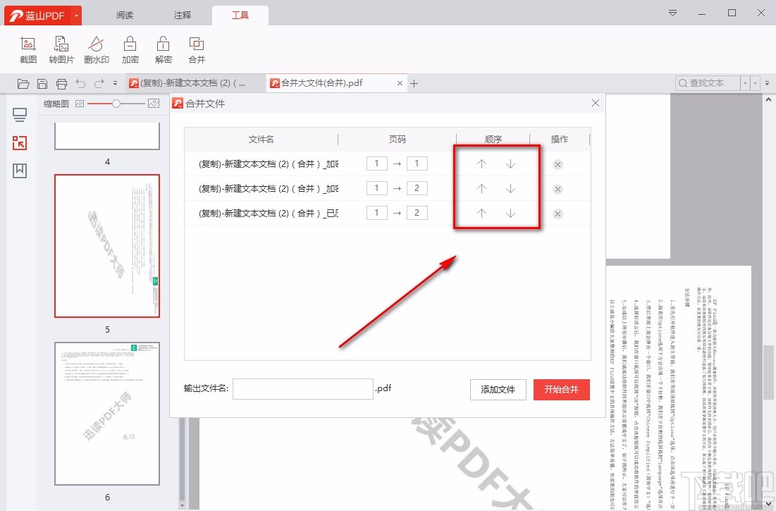 6.将文件添加到软件后,我们在文件名称后面找到“顺序”一栏,点击该栏下方的上移、下移按钮,就可以调整PDF合并的顺序。