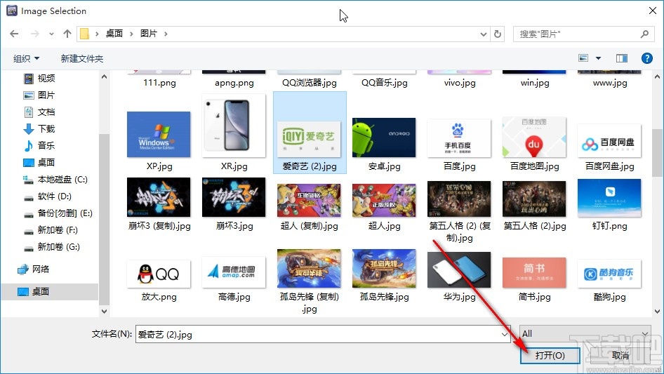 2.点击这个选项之后,下一步我们打开选择文件的界面,然后在界面中选择目标图片文件,选中之后点击右下角的打开按钮。