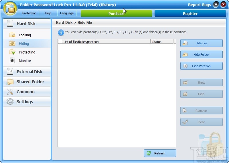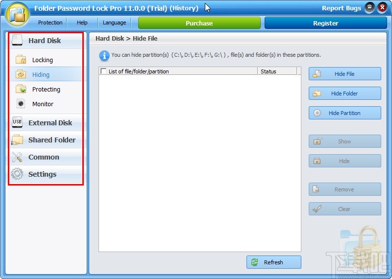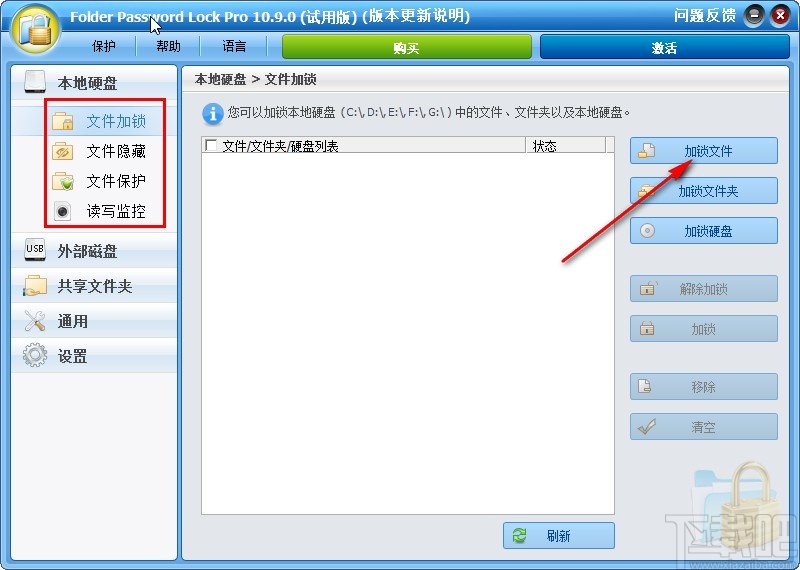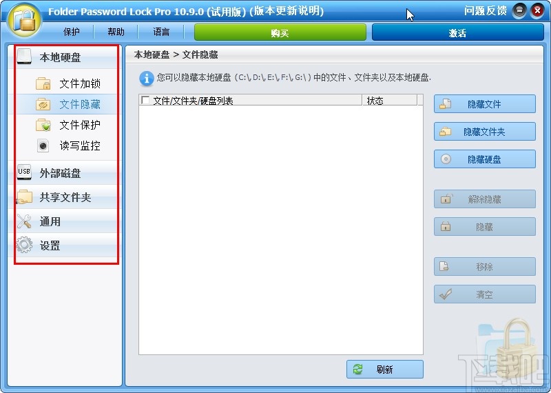 5.切换设置为中文界面之后我们就可以在左边选择功能模块,然后在右边选择想要加密、隐藏或者保护的文件按钮开始对文件进行操作了。