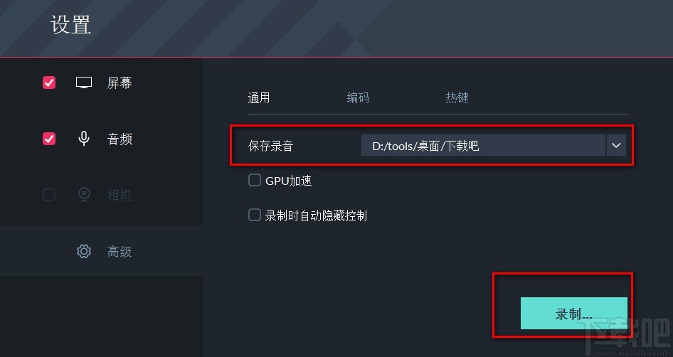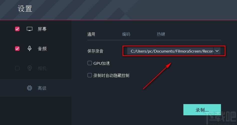 5.完成以上所有步骤后,我们在界面上可以看到“保存录音”选项后面的文本框中显示的就是刚刚设置的保存位置,这时候点击界面右下角的“录制”按钮,就可以开始录制音频。